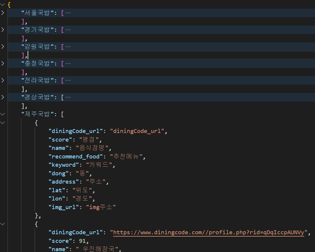 우선 파일 변경을 하기전 내가 원하는 json형태를 선정한다. 내가 생각한 data의 형태는 아래와 같이 key로 각 지역별 정보를 가져올 수 있고, value에는 Array [ ] ( = list ) 형태로 되어 있어서 후에 ReactNative로 App을 만들 때 각 음식점 정보를 불러올 수 있도록 선정하였다.