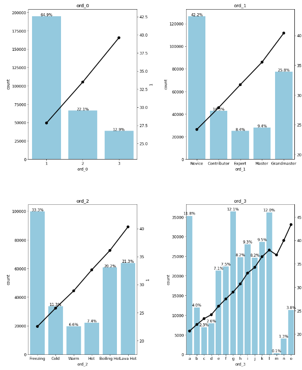 ord_1 : 캐글 등급이므로 등급으로 순서를 맞춤 --> Novice - Contributor -> Expert - > Grandmaster