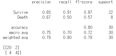 --> 위의 Classfication_report를 통해서 확인하면, preicison Death는 1.00 이고 recall Death는 0.38이다. 이를 해석하면