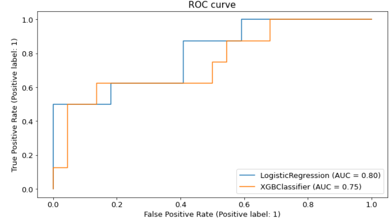 -> Roc Curve는 x축(False Positive Rate)에 비해서 y축(True Positive Rate)의 값이 빠르게 증가하는 경우 면적이 1에 가깝게 채워지게 되는 경우 성능이 좋은 모델로, 두 모델의 성능차이는 크게 없는 것으로 확인할 수 있다.