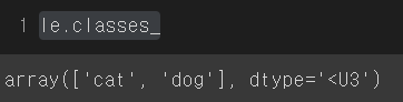 X_valid[0] 이미지를 가지고 예측을 수행하면 results가 [1,0]의 결과가 나온 것을 볼 수 있다. 이는 cat / dog 예측에서 학습 시 LabelEncoder의 순서가 반영 된 것으로 아래 사진을 보면 cat / dog의 순서로 [1 , 0] 일 경우 cat으로 예측한 것을 확인할 수 있다.
