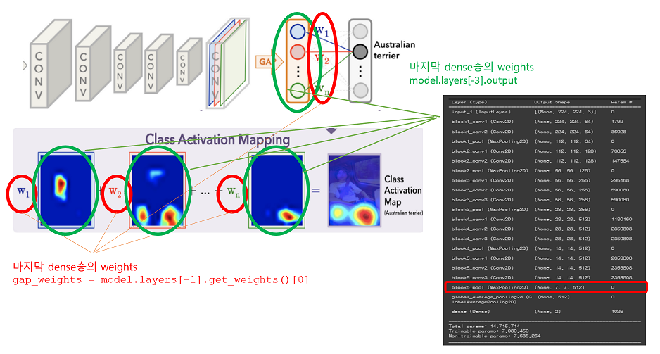 위의 gap_weights가 w1,w2 ... 를 의미한다. shape의 (512,2)를 보면 CNN의 CONV layer의 마지막이 (7, 7, 512)로 feature map이 512개가 생겻는데 이를 각각 GAP(global avg pooling)을 해서 512개가 나오고 강아지 고양이를 구분하는 것으로 label class가 2개이므로 마지막 dense에 연결될 때는 weights가 2개가 필요하게 된다.