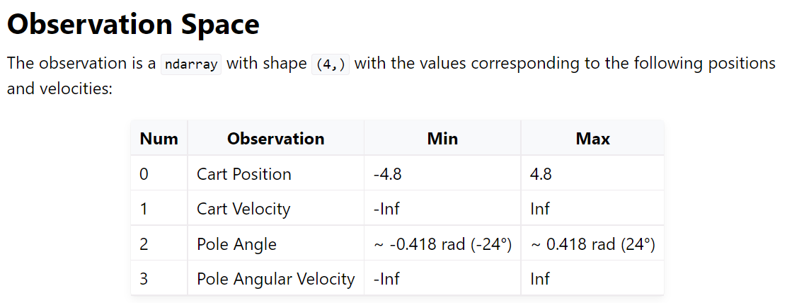 - Observation Space : 여기서 Observation은 State와 동일한 의미로 상태를 나타낸다. 상태는 4가지가 있으며, 0: 위치 / 1 : 속도 / 2 : 폴 각도 / 3: 폴 각속도 등을 나타낸다.