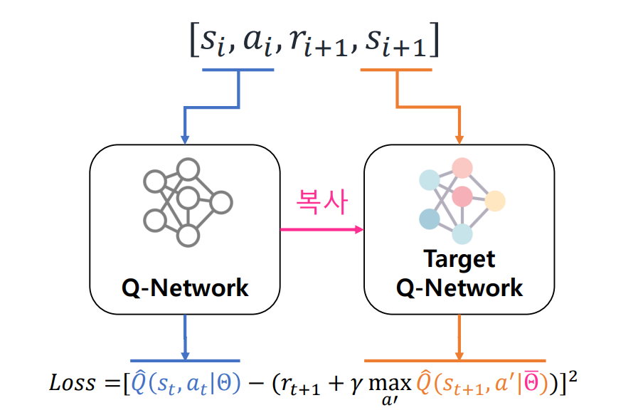 위와 같이 q-network가 신경망으로 되어있는 데, state를 입력으로 받아 행동가치함수 (q_value)를 출력으로 생성한다. 여기서 state_t 와 state_t+1을 각 입력으로 넣은 Q-network 와 target Q-netwrok의 output인 q_value의 차이를 줄이게 parameter를 학습하여 해당 state에서 행동가치가 가장 높은 action을 생성하게 하는 것으로 정리할 수 있다.