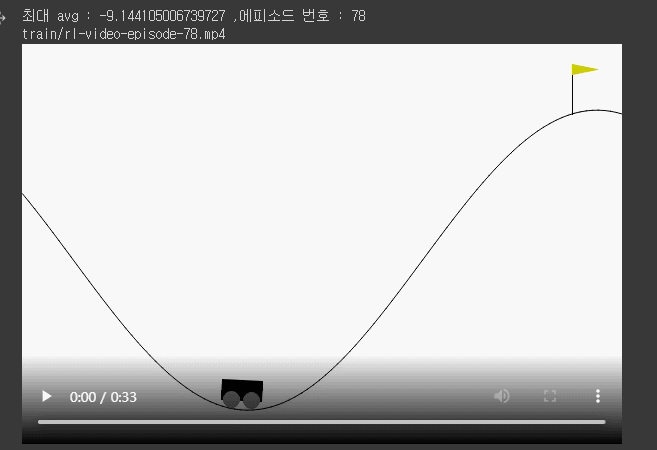 print(f'episode: {epoch:3d} | success: {success} | car_pos_max : {max_position : .3f} | avg_reward : {avg_reward_episode : .3f} | score_avg : {avg_score_episode : .3f} | step : {step} | loss : {np.mean(loss_list):.2f} | sigma : {np.mean(sigma) :.2f} ')