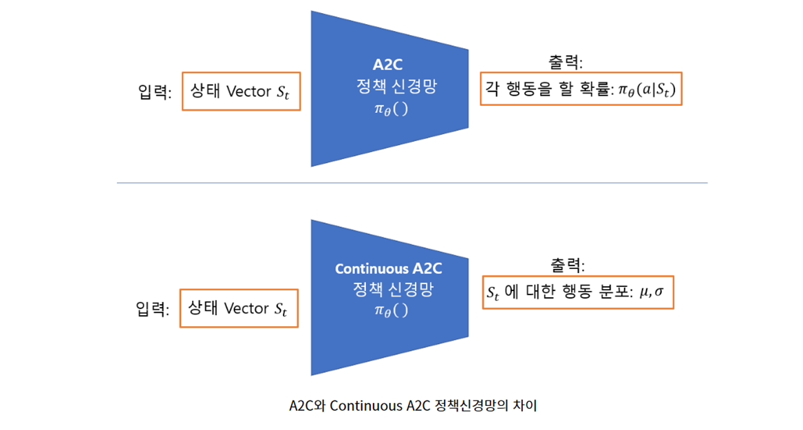 이번에는 실습할 내용은Continuos A2C로 A2C에서 Policy를 action이 Discreate (이산적) 인 것이 아니라 Continuos(연속적)인 정규분포를 형태로 만드는 것으로 기존과 큰 차이점은 Actor 신경망을 만들 때, 아래와 같이 정책신경망이 μ (평균),