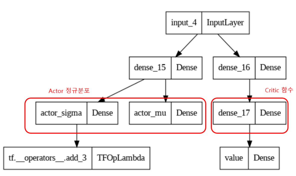 ### Actor (정책평가) -> 정규분포로 변경하기 위해 mu , sigma 생성함 -> 각각의 action에 대한 정규분포를 생성함.