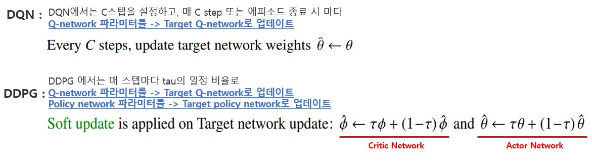 -> DQN의 경우 C스텝 또는 에피소드 종료 시 마다 Target update를 수행한다. 그러나 DDPG에서는 매스텝 업데이트를 수행하는 대신 일정 비율(tau)만큼 Soft Update를 수행한다.