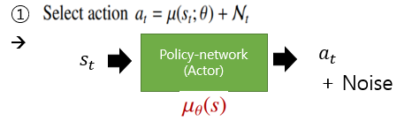 먼저 Actor Network를 통해서 현재 state를 입력받아 Deterministic Policy를 통해 action을 선택한다. 선택된 action에 탐험을위하여 Noise를 추가하고 이것으로 Env 환경과 상호작용을 한다.