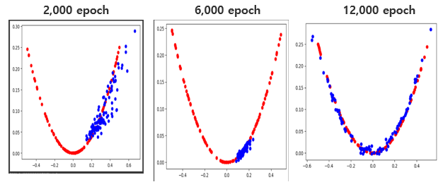 이번 실습의 내용을 정리하면 y=x^2에 해당하는 data sample을 가지고 학습시켜 실제와 비슷한 분포를 지닌 가짜 sample을 만드는 것으로 epoch가 진행됨에 따라 실제 data 와 유사해 지는 것을 볼 수 있다.