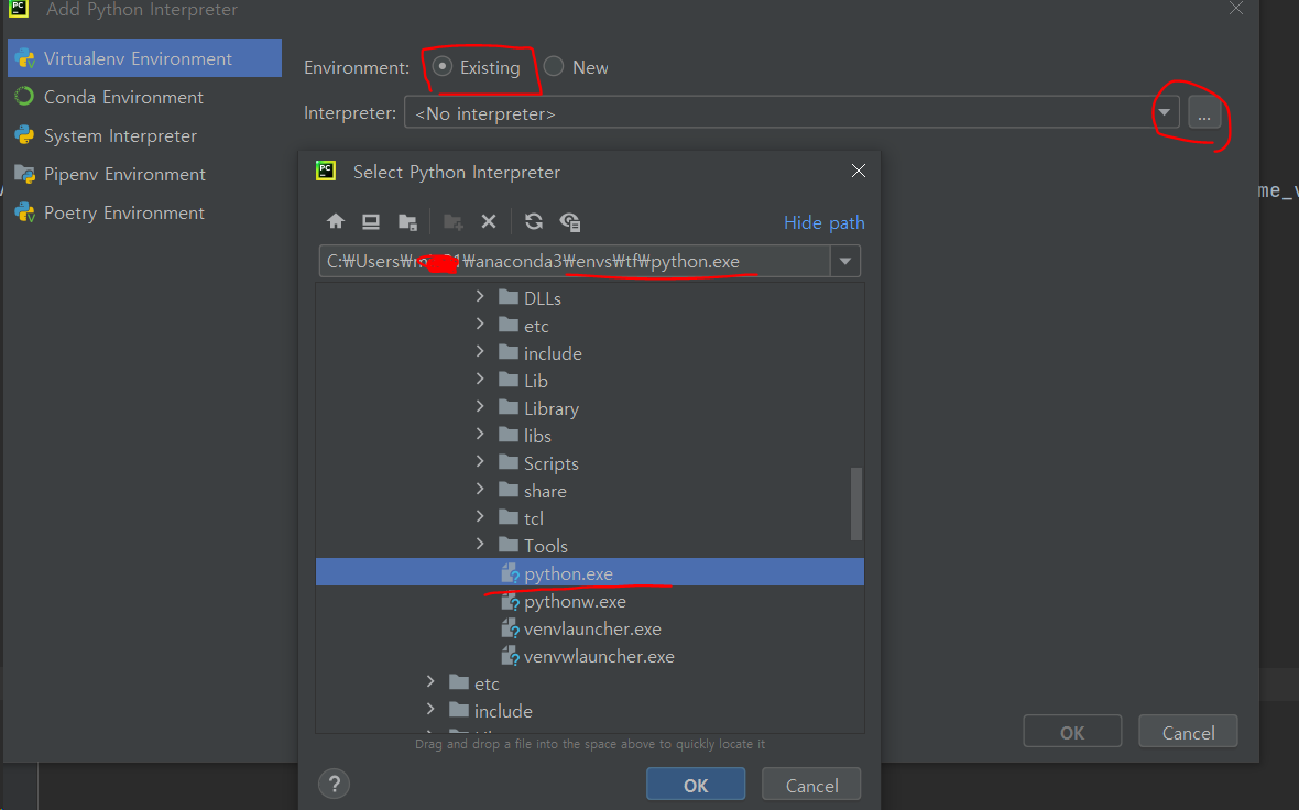 --- 설치된 interpreter를 불러오기 위해서는 아래의 그림과 같이 python.exe 를 불러온다.