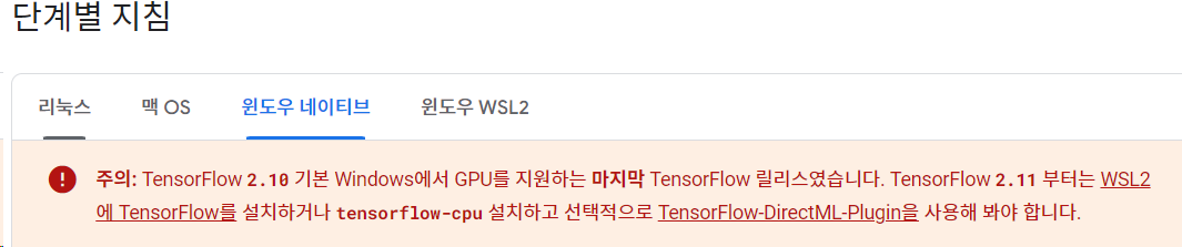 그러나 현재 tensorflow에서 윈도우로 아래와 같이 2.10이 GPU를 지원하는 마지막 릴리스로 2.10을 설치하기 위해서