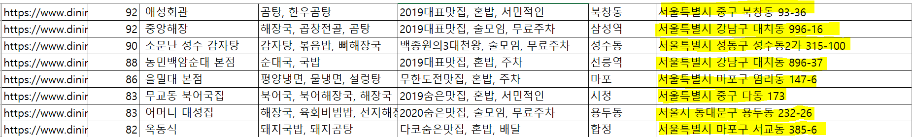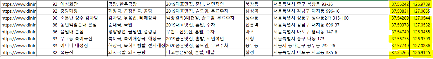 -> 앞에서 구한 프로젝트에서 크롤링을 하고 나면 아래와 같은 형식의 엑셀파일이 생성된다. 이 때 음식점의 주소를 얻게 되는 데, 지도상에 표시를 하려면 위도 / 경도의 지리적인 정보가 필요하다. 구글지도에서 검색해서 노가다로 얻을 수 있고, 구글 API, 카카오 API, 네이버 API 등을 사용하는 여러 방법이 있다.