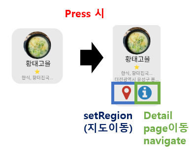 옆에 보이는 그림이 FoodComponent이며 터치시에 아래의 지도이동 아이콘과 Detail 페이지 이동 아이콘이 접었다가 펴지면서 생기고,