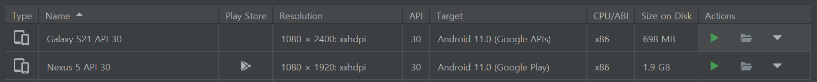 한가지 중요한 것은 안드로이드 에뮬레이터 사용시에는 아래의 사진에서 Play Store에 표시가 된 경우에만 지도가 표시가 된다. 그렇지 않으면 서비스에 연결할 수 없다는 표시가 나면서 에뮬레이터가 지도가 표시 되지 않는다.