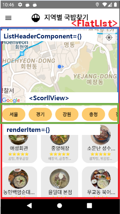 해당 페이지는 전체가 FlatList로 되어있으며, 상단의 지도와 지역선택의 전체가 ListHeaderComponent={} 에 들어가 있으며, stickyHeaderIndices={[0]} 옵션을 주어서 화면에 고정되게 하였다. css상에서 zIndex를 높여서 항상위에 가도록 구성하였다.