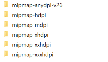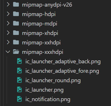 최종적으로 아래와 같이 각 해상도의 mipmap 폴더 내에 ic_launcher.png 와 ic_notification.png 가 있으면 적용이 된다.