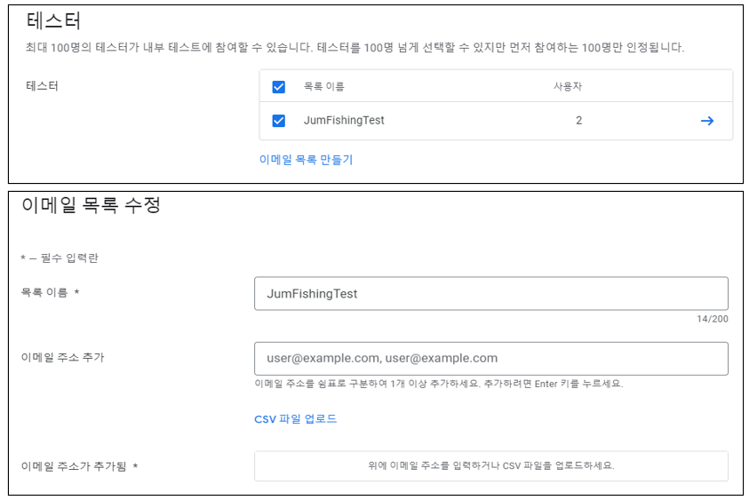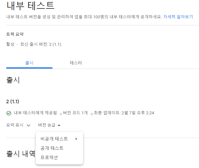 공개 테스트 / 비공개 테스트 / 내부 테스트의 방법이 있으면, 내 경우는 내부테스트만 사용해보았다. 내부 테스트는 말그대로 프로덕션으로 정식배포 하기전에 내가 지정한 내부테스터를 동원하여 앱을 테스트하는 것을 의미한다. 내부 테스터 등록은 최대 100명 까지 되며, email을 등록하면 링크를 통해 googleplay로 접속하여 내부테스터를 실시할 수 있다.