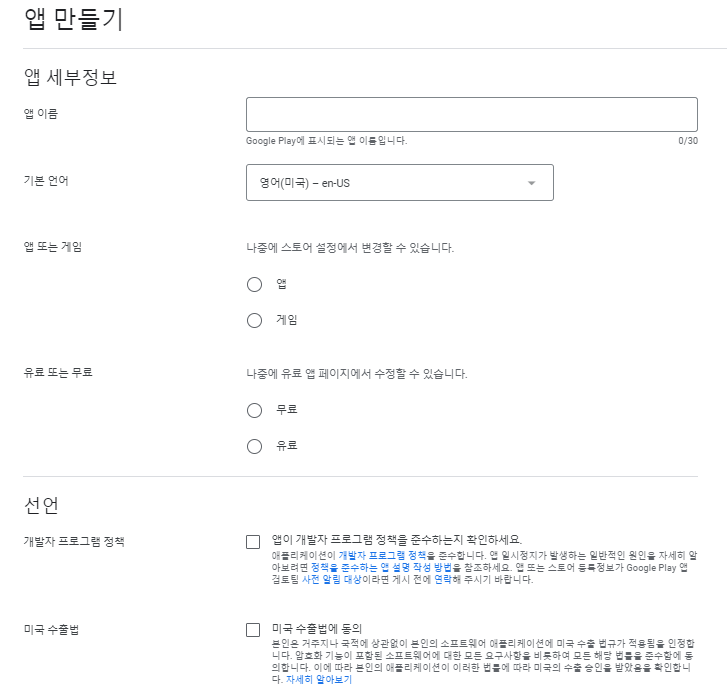 구글플레이를 등록하려면 구글개발자 계정이 있어야 한다. 계정 등록 비용은 $25로 한화로 약 3만원 정도되는 일회성비용 수수료는 한번만 내면된다. 본격적으로 앱을 등록할 때는 생각보다 많은 것들을 입력해야 한다. 개발을 하면 바로 출시하고 끝일줄 알지만, 작성하고 해야할 일 들이 매우 많이 있다.