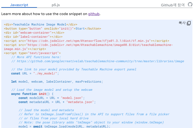 또한 아래를 보면 자바스크립트 코드를 통해 모델을 불러올 수 있는 스니펫이 있다.