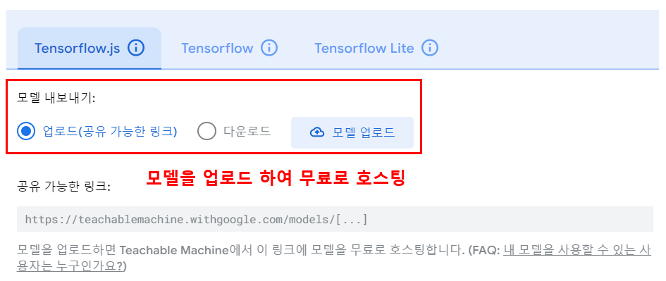 위와 같이 사진을 업로드하고 모델을 학습하면 json의 형태로 다운로드 하거나 업로드하여 호스팅을 이용할 수 있다. 내 경우는 업로드하여 호스팅하는 방법을 선택하였다.