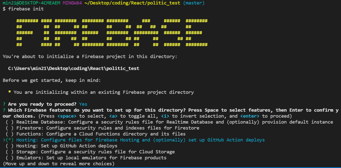-> firebase init을 실행 하면 위와 같은 단계로 진행되는 데, 호스팅 서비스를 사용할 것이므로 hosting을 선택한다.