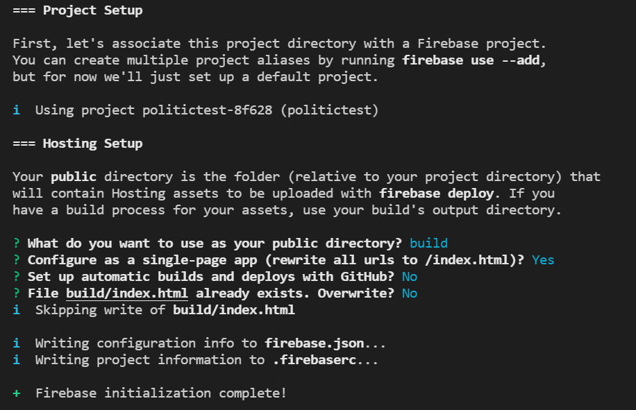 또한 어떤 폴더를 public 폴더로 사용할 것이냐고 물어보는데, react의 경우는 npm run build를 수행하게 되면 build폴더에 해당 내용이 들어가게 되므로, build 폴더를 호스팅 해야한다. 그러므로 build를 설정하고, sing-page-app이므로 Yes를 선택한다. Githup과 연동을 할것임을 물어보면 내 경우는 No로 진행하였고, 마지막으로 기존에 있는 index.html을 덮어 쓸 것인지를 물어보는 데 이때 No를 해야한다. 안그러면 Firebase가 가지고 있는 기본적인 index.html로 덮어씌워 버리게 되게 때문이다.