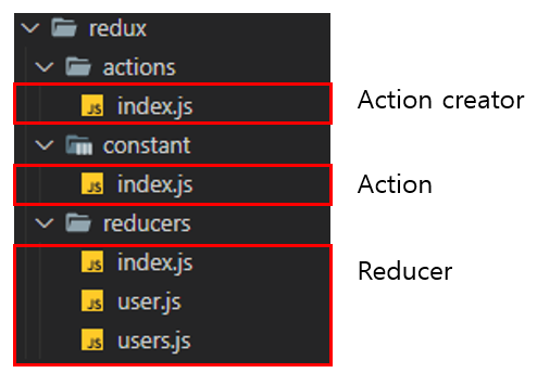 -> redux 폴더안에는 위와 같이 Action creator / Action / Reducer로 분리 되어있다. 해당 프로젝트에서는 reducer를 user / users 2개를 사용하고, index.js에서 통합시켜 하나의 store를 만들어서 사용한다. 각 파일 내용을 통해서 어떤식으로 구조화 되어 있는 지 확인해 보자.