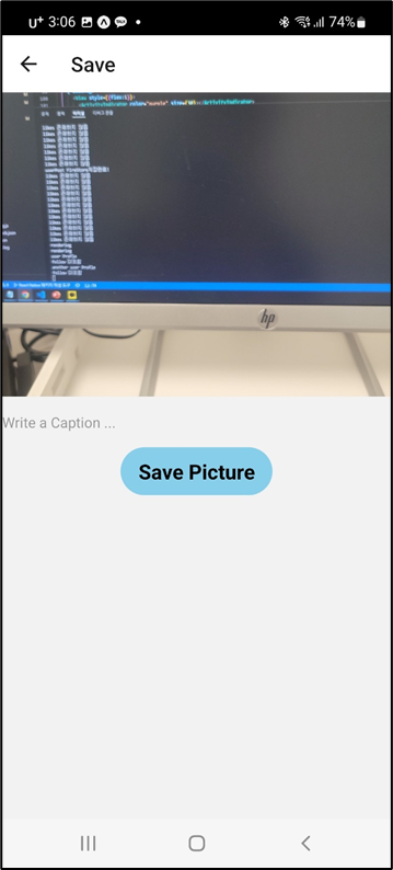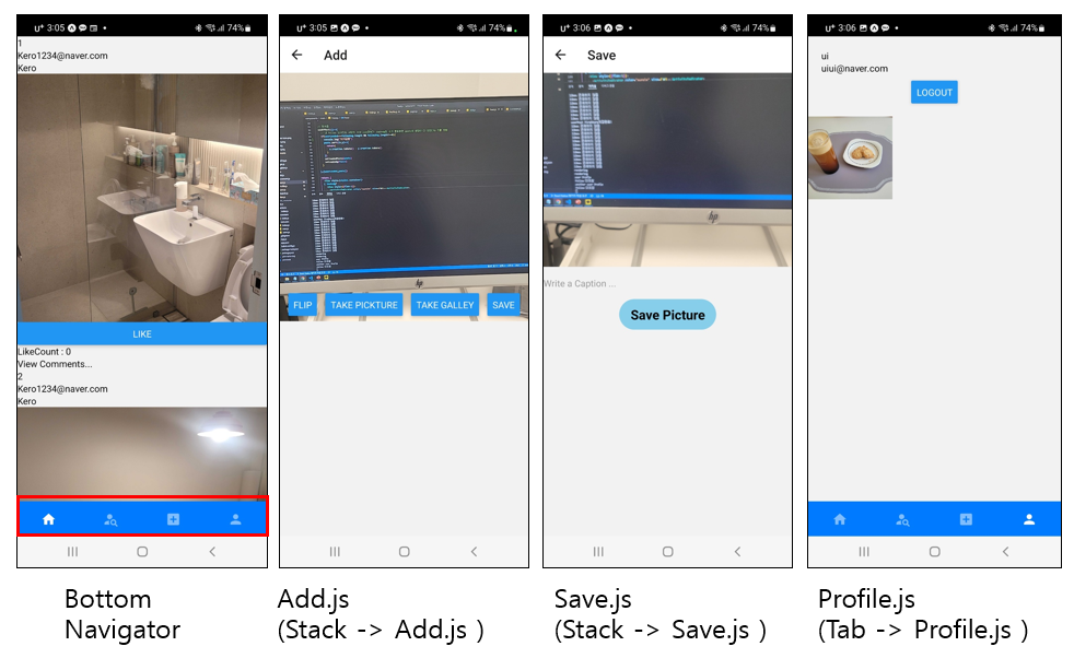 -> 위에서 언급한대로 Add.js로 이동해서 카메라 혹은 갤러리에 접근하여 사진을 가져오게 되고 위의그림 2번째에서 save 버튼을 클릭하면 Save.js로 이동하여 실제로 사진이 저장하게된다. Save.js에서 사진이 저장된 후 다시 TabNavigator에 있는 Profile로 이동되어 최종적으로 위의그림 4번째 처럼 사진이 업로드 되게 된다.