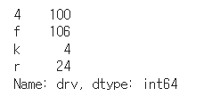 17) mpg 데이터를 불러와 일부러 이상치를 만들겠습니다. drv 변수의 값은 4,f,r 세종류입니다. 몇개의 행에 존재할 수 없는 값 k를 할당하겠습니다. cty 변수도 몇개의 행에 극단적으로 크거나 작은 값을 할당하겠습니다.