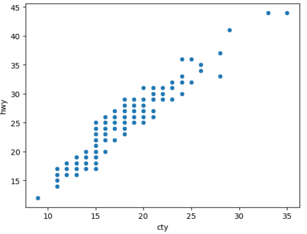20) mpg데이터의 cty와 hwy 간에 어떤 관계가 있는 지 알아보려고 합니다. x축은 cty, y축은 hwy로 된 산점도를 만들어 보세요.