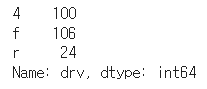 df['drv'].value_counts().sort_index()