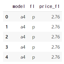 14) 연료 가격 변수가 잘 추가 됐는지 확인하기 위해 model,fl,price_fl 변수를 추출해 앞부분 5행을 출력해보세요.