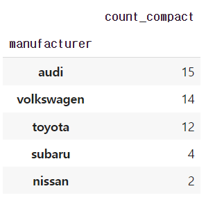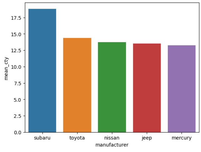 df_cty=df.query(' category == "suv" ').groupby('manufacturer',as_index=False).agg( mean_cty = ('cty','mean') ).sort_values('mean_cty',ascending=False)