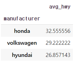 avg_hwy=df.query('manufacturer in ["chevrolet","ford", "honda"]')