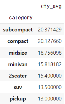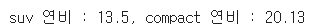 print(f'suv 연비 : {round(suv_cty,2)}, compact 연비 : {round(compact_cty,2)}')