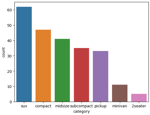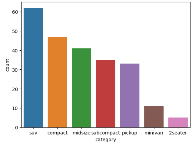 22) 자동차 중에 어떤 category가 많은 지 알아보려고 합니다. sns.barplot()을 이용해 자동차 종류별 빈도를 표현한 막대 그래프를 만들어 보세요. 막대는 빈도가 높은 순으로 정렬하세요.