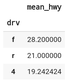 df.dropna(subset=['hwy']).groupby('drv').agg(mean_hwy=('hwy','mean')).sort_values('mean_hwy',ascending=False)