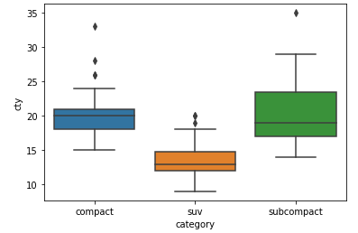 5) 자동차 종류에 따라 도시 연비가 어떻게 다른 지 알아보려고 합니다. 앞에서 추출한 데이터를 이용한 category(자동차 종류)가 'suv' 자동차와 'compact'인 자동차 중 어떤 자동차의 cty(도시연비) 평균이 더 높은지 알아보세요.
