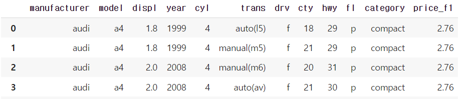 mpg 데이터에서 연료 종류를 나타낸 f1 변수는 있지만 연료가격을 나타낸 변수는 없습니다.