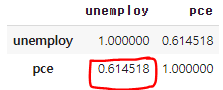 # economics 데이터를 이용하여 unemploy (실업자 수) 와 pce (개인 소비 지출) 간에 상관관계가 있는 지 확인
