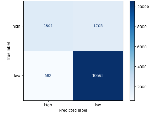-> 기본적으로 자료에서 low인 사람이 76%로 매우 많았기 때문에, 항상 low만 말하는 모델을 만든다면 적어도 76% 확률은 될 것 이므로 accuracy만 보아서는 안된다.
