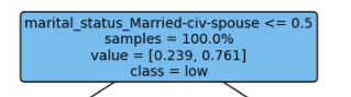 3) 오른쪽에서는 비혼(1)의 경우는 전체의 45.8%에 해당되며, value=[0.447 , 0.553] 으로 거의 비슷하지만 low일 확률이 55.3%더 높으므로 low에 해당하고 색은 옅은 편이다.