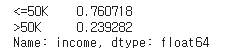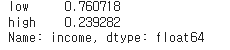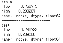 2) value=[0.239 , 0.761] 의 의미는 target변수의 비율로 "high " , "low" 알파벳순서로 나타내며, 전체 100% 중 low의 비율이 76.1% 가 된다는 의미이다.