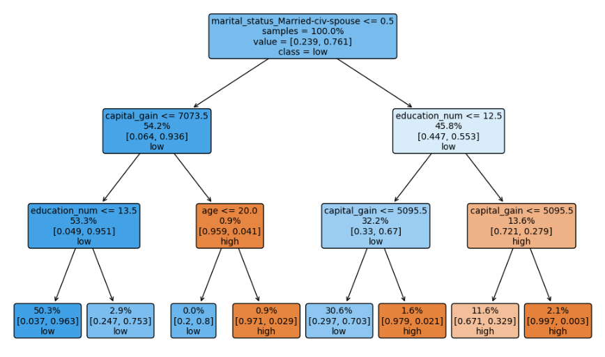 -> 실제로 소득이 'high' 인 사람에서 51.3%를 'high' 라고 찾아냈고, 나머지 48.7%는 'low'라고 예측을 해서 틀리 경우이다.