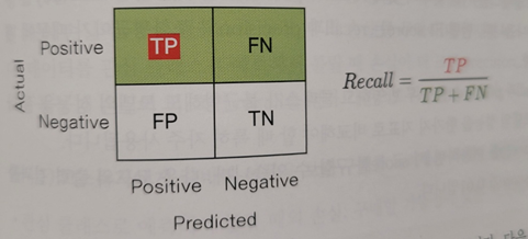 -> 실제 데이터가 Positive인 경우에서 내가 Positive라고 해서 맞은 확률