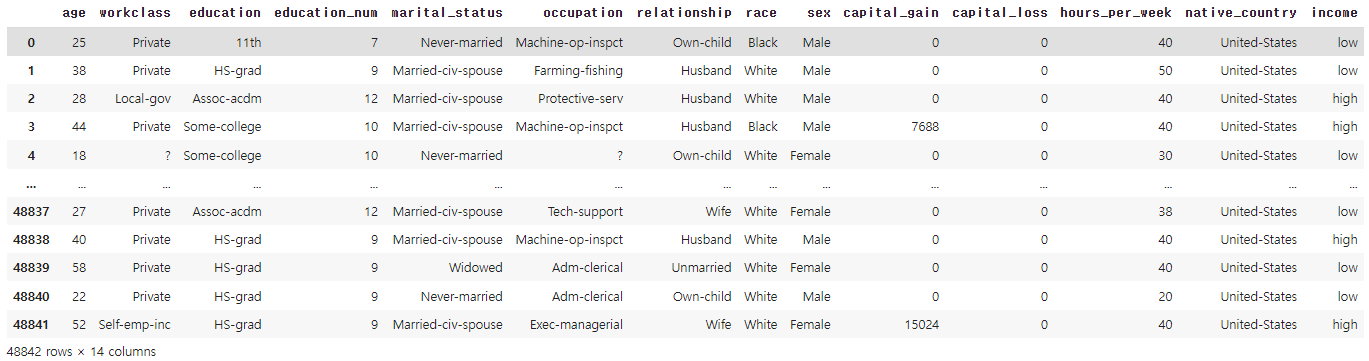 # >50k 경우를 high 그렇지 않은 경우를 low로 변경함
