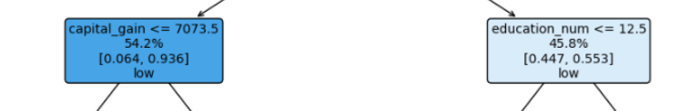 2) 왼쪽에서 미혼(0) 의 경우는 전체의 54.2%에 해당되며, value=[0.064, 0.936] 으로 low일 확률이 93.6%가 된다.