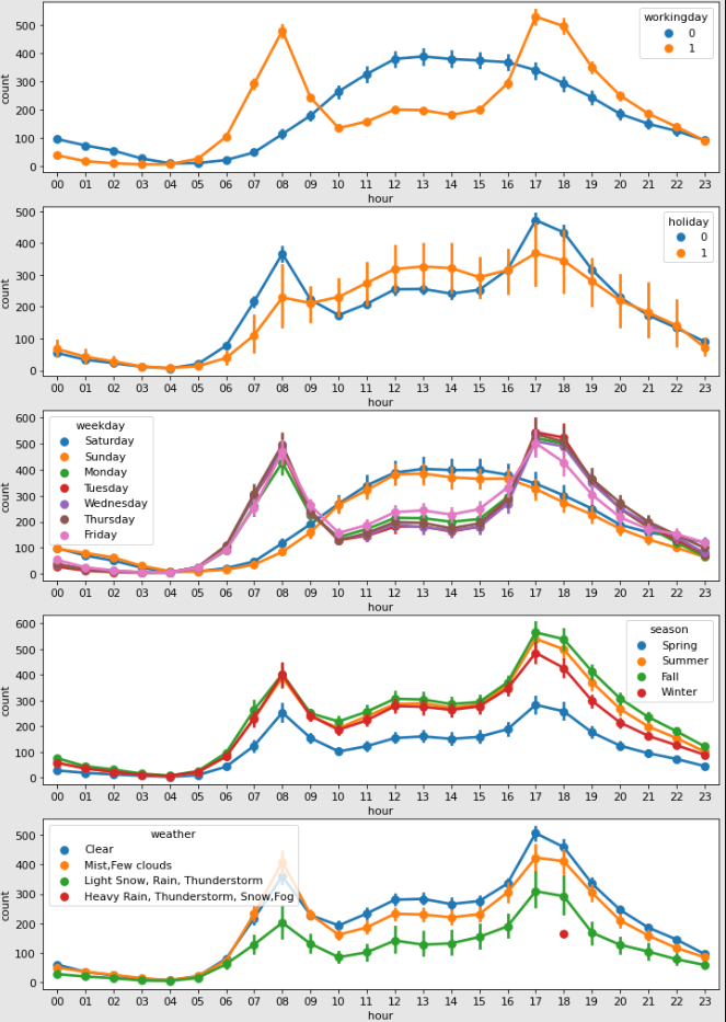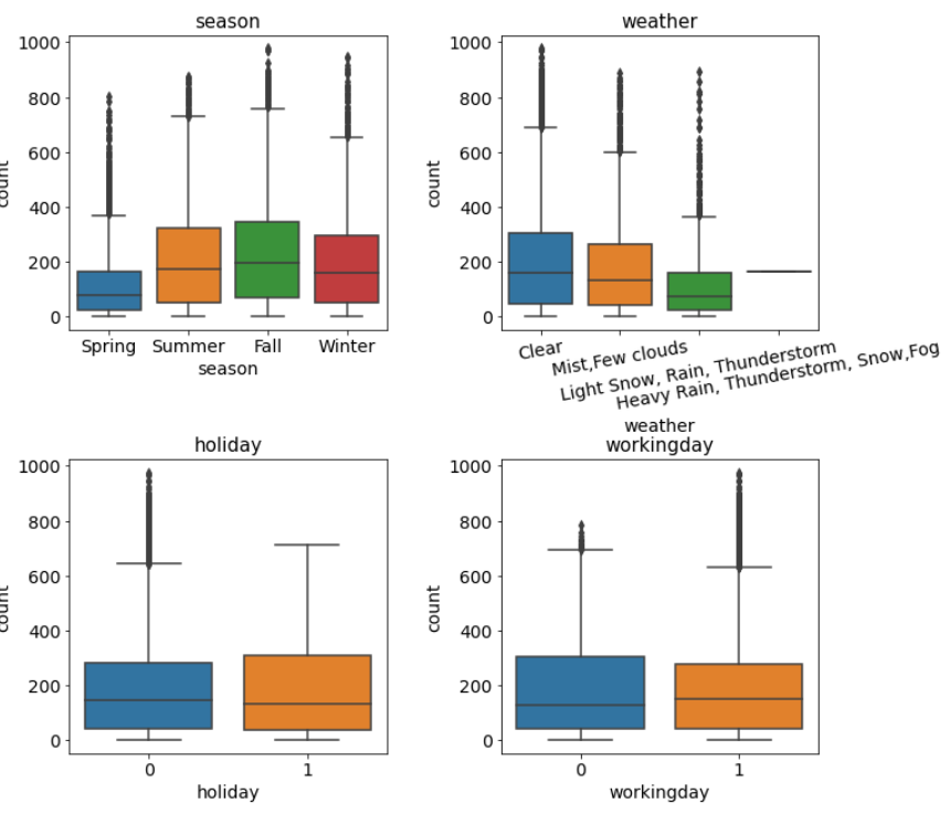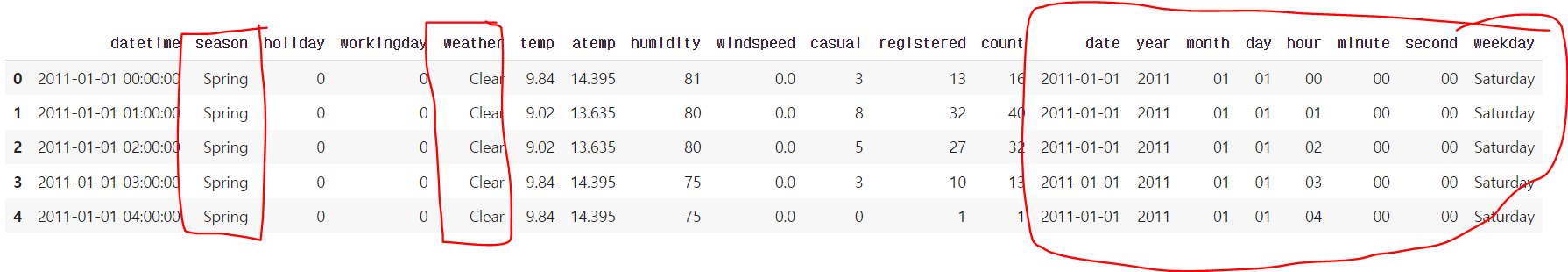 2-3) season과 weather 시각화를 위해 숫자형 --> 범주형으로 변경함