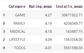 # 점유율 상위 5개의 카테고리를 구하고, 각각의 Rating 평균, Installs 평균 구하기